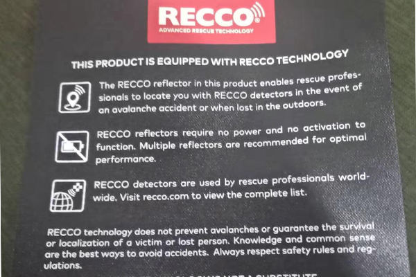 思諾華服飾&睿牛制衣是一家20年主營(yíng)沖鋒衣、滑雪服的定制生產(chǎn)廠家,20年制作研究戶外服裝,戶外服裝的制作工藝、功能性都要求嚴(yán)格,對(duì)于這一RECCO,它是雪崩救援系統(tǒng)的簡(jiǎn)稱,RECCO 是用于定位雪崩受難者的電子系統(tǒng)。