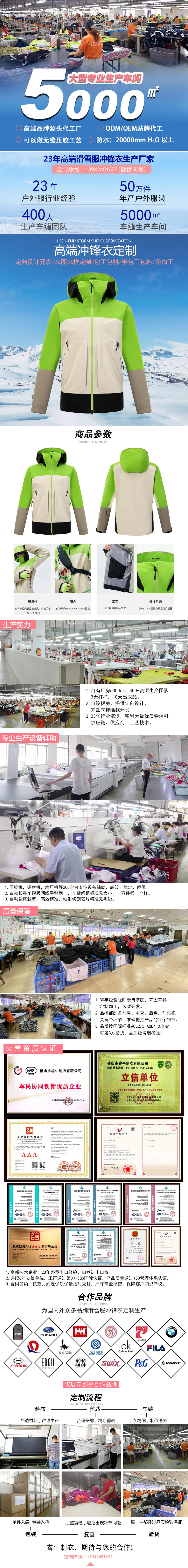 防水拉鏈:硬殼沖鋒衣生產使用YKK防水壓膠拉鏈,承受數萬次拉合,可根據客戶的要求進行定制特殊配件。