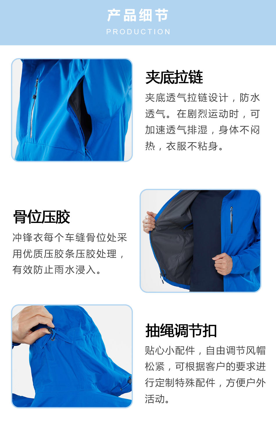 抽繩調(diào)節(jié)扣:貼心小配件,自由調(diào)節(jié)風(fēng)帽松緊,可根據(jù)客戶的要求進(jìn)行定制特殊配件,方便戶外活動(dòng)。