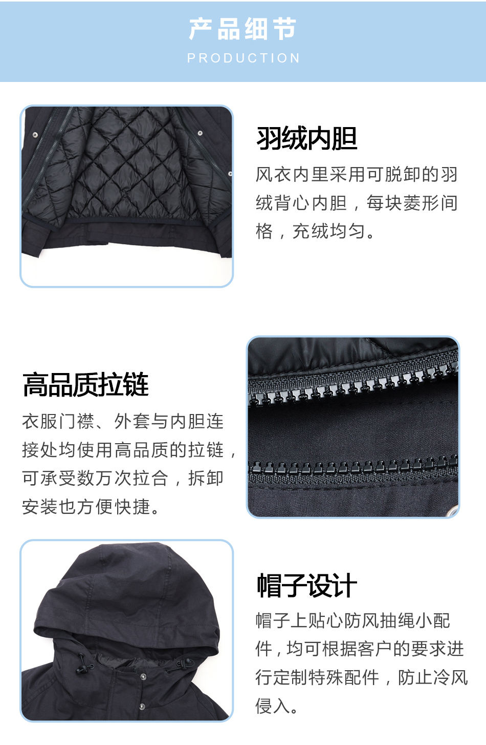 帽子設計:帽子上貼心防風抽繩小配件,均可根據客戶的要求進行戶外風衣套裝定制其特殊配件,防止冷風侵入。